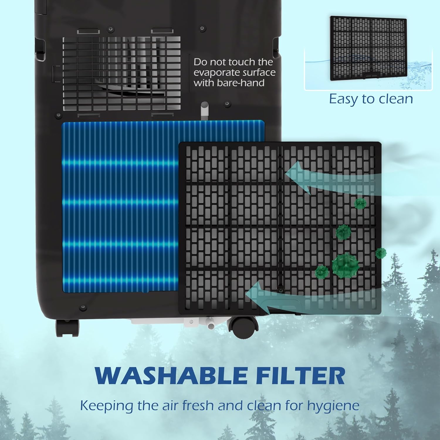 Energy-Saving Features: The air conditioner offers sleep mode, a 24-hour programmable timer, and a washable filter for continuous fresh air. Its self-evaporating system eliminates manual water removal.