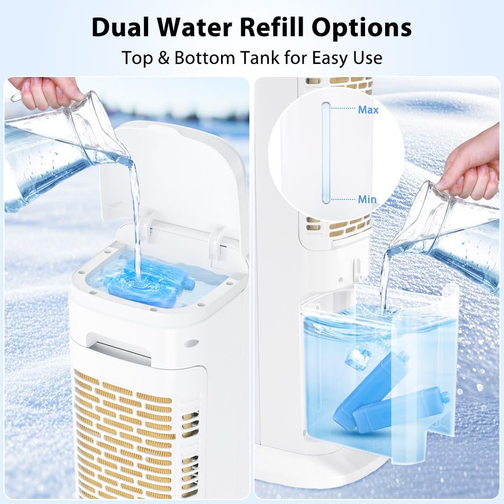 Stay cool effortlessly with this 41-inch Bladeless Tower Fan! Its 1.32-gallon tank offers dual refill options (top lid + bottom tank) and works with 4 ice boxes (2 large + 2 small) for ultra-chilled airflow. Choose from 3 modes (Fan/Cool/Sleep), 12-hour timer, and 100° rotation. Quiet (<45dB), energy-saving, and pet-friendly design—perfect for bedrooms, offices, or pairing with AC.