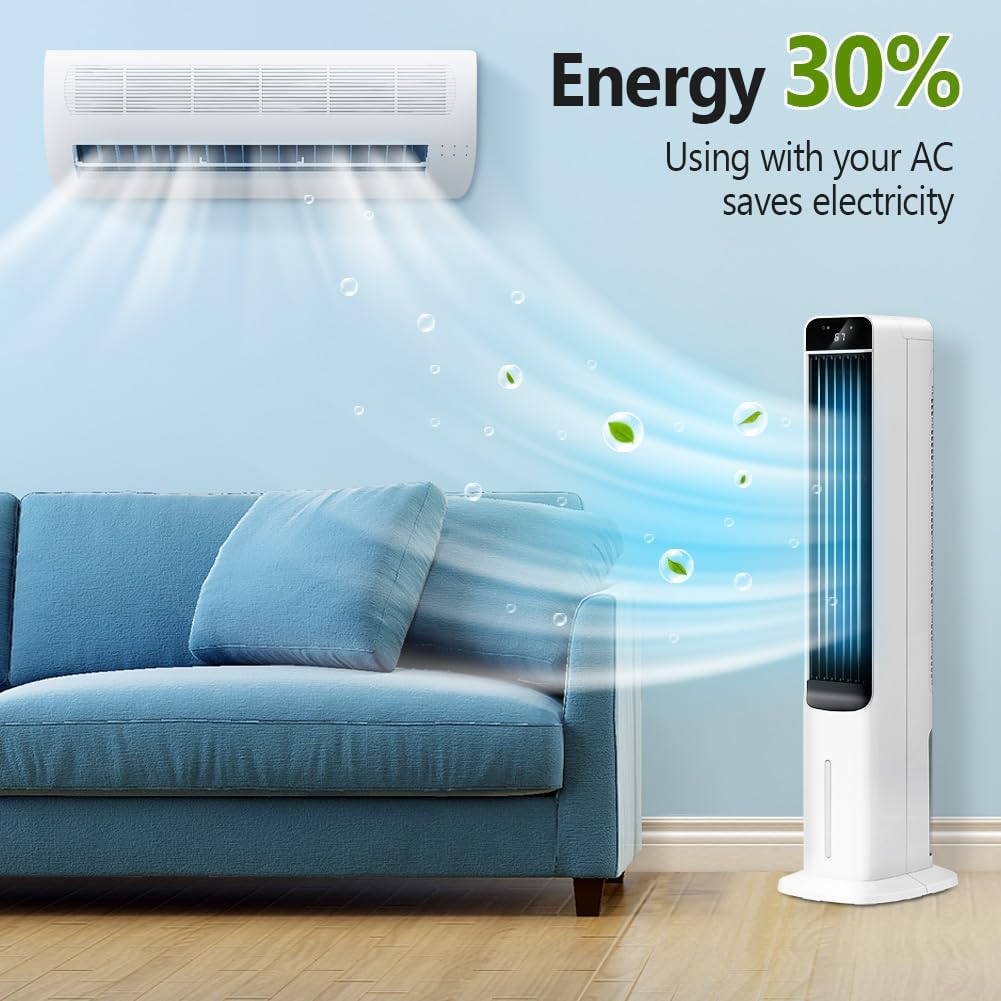 100° Oscillation:This evaporative cooler is tall, has a great oscillating area so it covers a great portion of the room, efficiently circulate the air around the room so every person in the room can enjoy the cool air.Pair it with your air conditioner to cool the entire room efficiently while saving 30% on electricity compared to using AC alone.