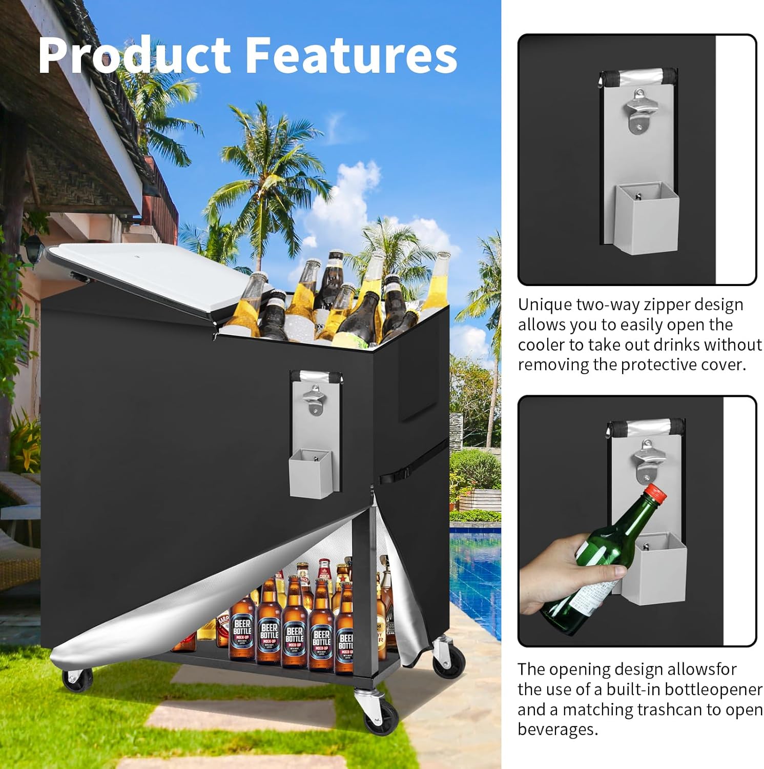 Upgraded portable design,For easy use, the top of the cooler cart cover is sealed with a waterproof zipper, which makes it easy for you and your guests to take out drinks from the cooler cart. The opening design allows the use of the built-in bottle opener and the matching trash can to open the drinks. The lower layer is sealed with 4 waterproof zippers, so you can take out the items in the lower layer without removing the cooler cart cover.