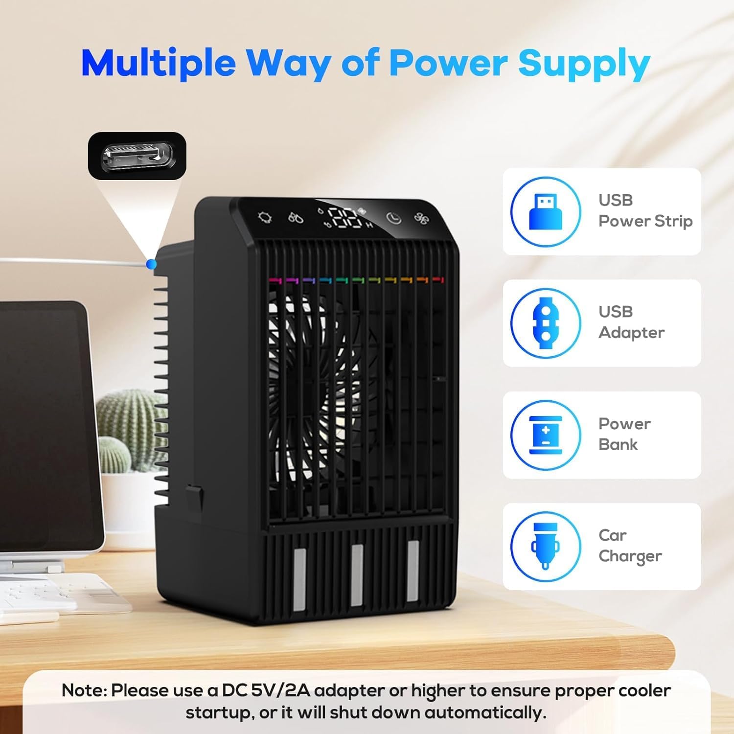 ❄️Multifunctional Portable Air Conditioner: We have 2 air modes, Natural wind mode: no need to add water to blow cool air. Cooling Mode: add water or ice cubes to achieve cooling effect, we are equipped with 2 spray vents which can continuously produce cold air to make you more refreshing and cooler.