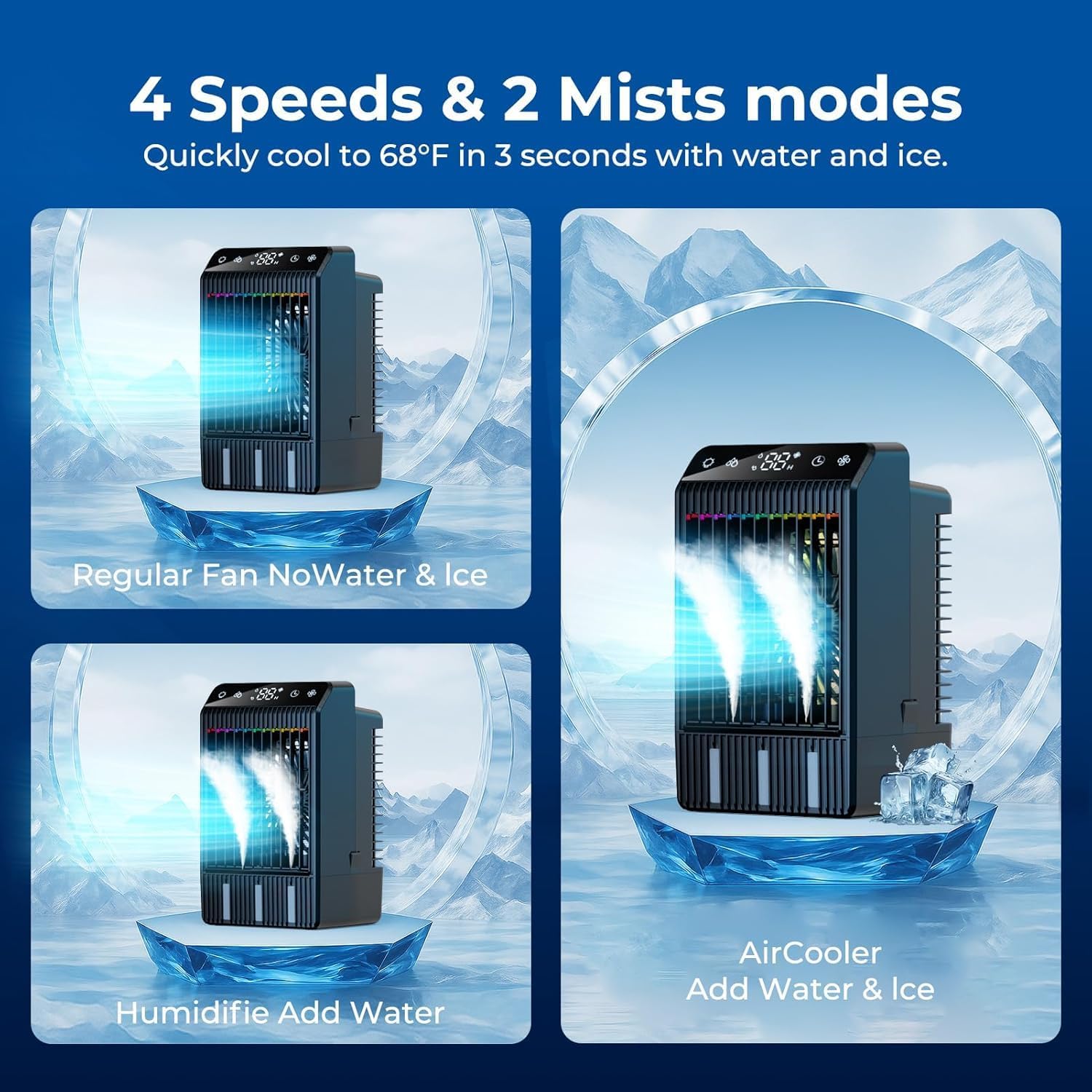 ❄️4 Wind Speeds & 2 Cool Mist Modes: 4 adjustable wind speeds and 2 misting modes to customize your own cooling experience.1000ml large capacity water tank provides up to 10-12 hours of continuous misting to improve air humidity and help you stay refreshed and hydrated.