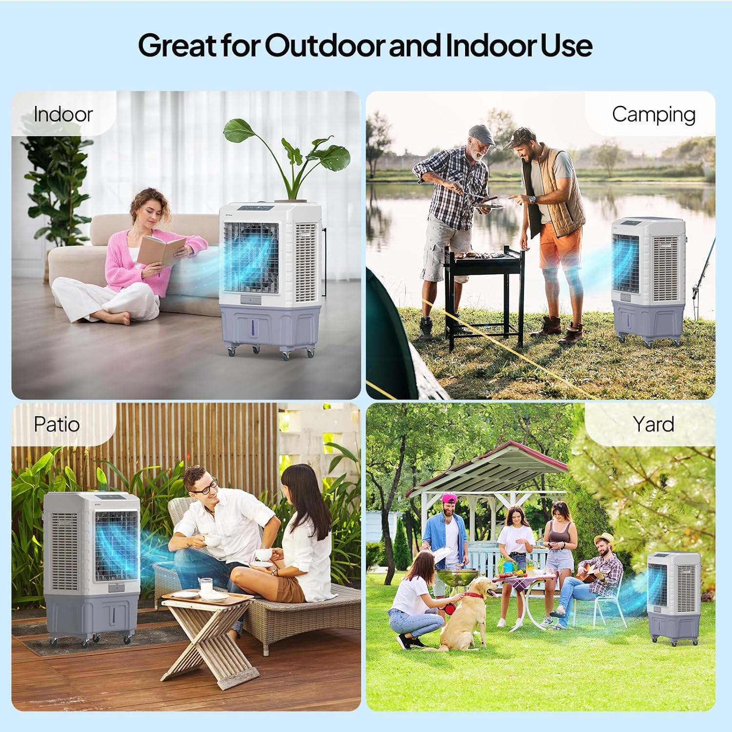 ❄【Easy Movement & Widely Used】Lightweight design with 4 rolling wheels, you can effortlessly push it to slide across the floor to any room when needed, even with a full tank of water. It is very convenient to use from indoor to outdoor, such as home, living room, office, garage, workshop, yard, patio, camping and more. It’s cooler and more comfortable to use our evaporative cooler fan together with an air conditioner on extremely hot summer days